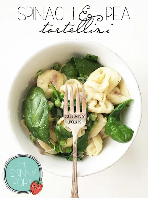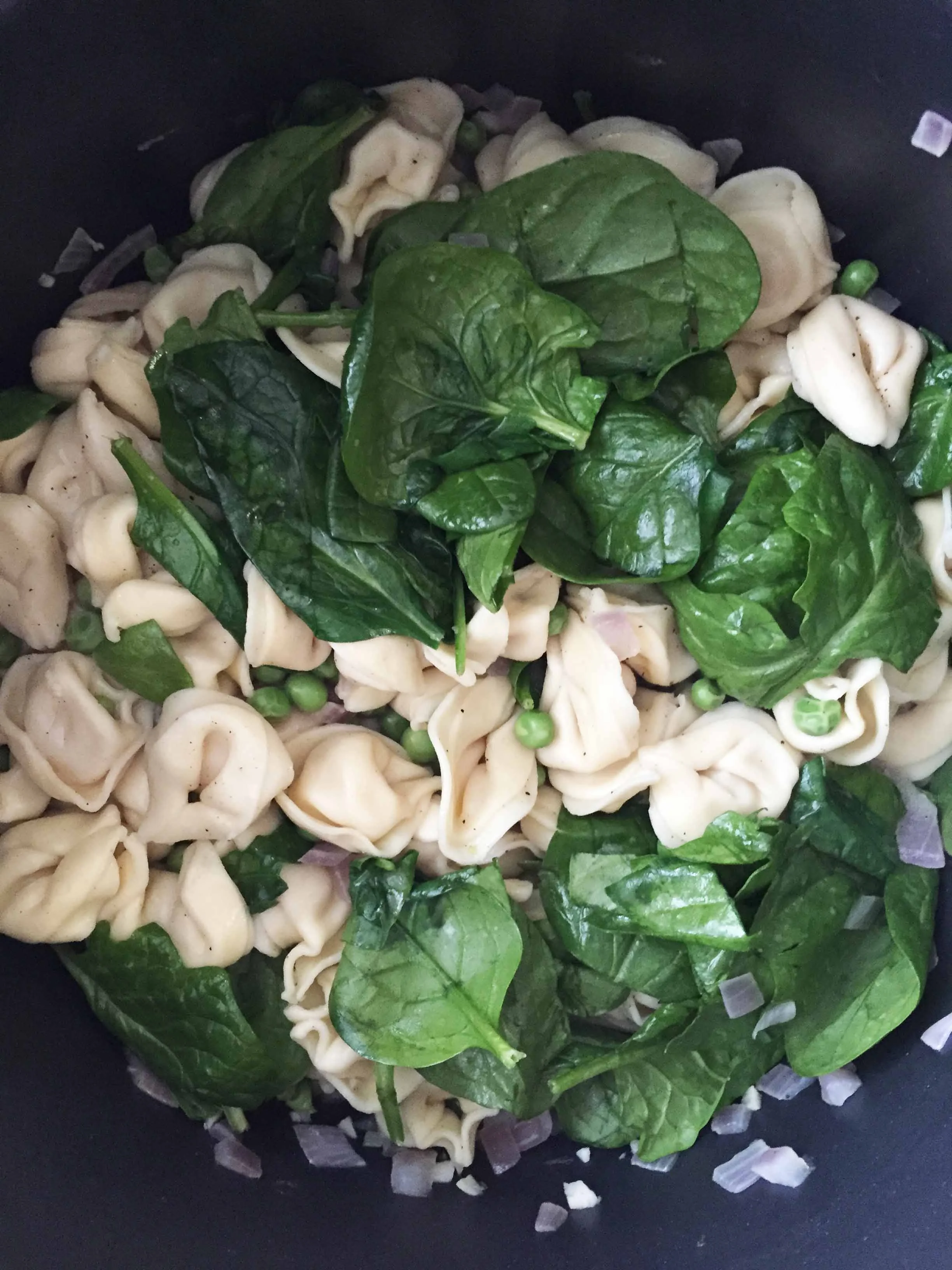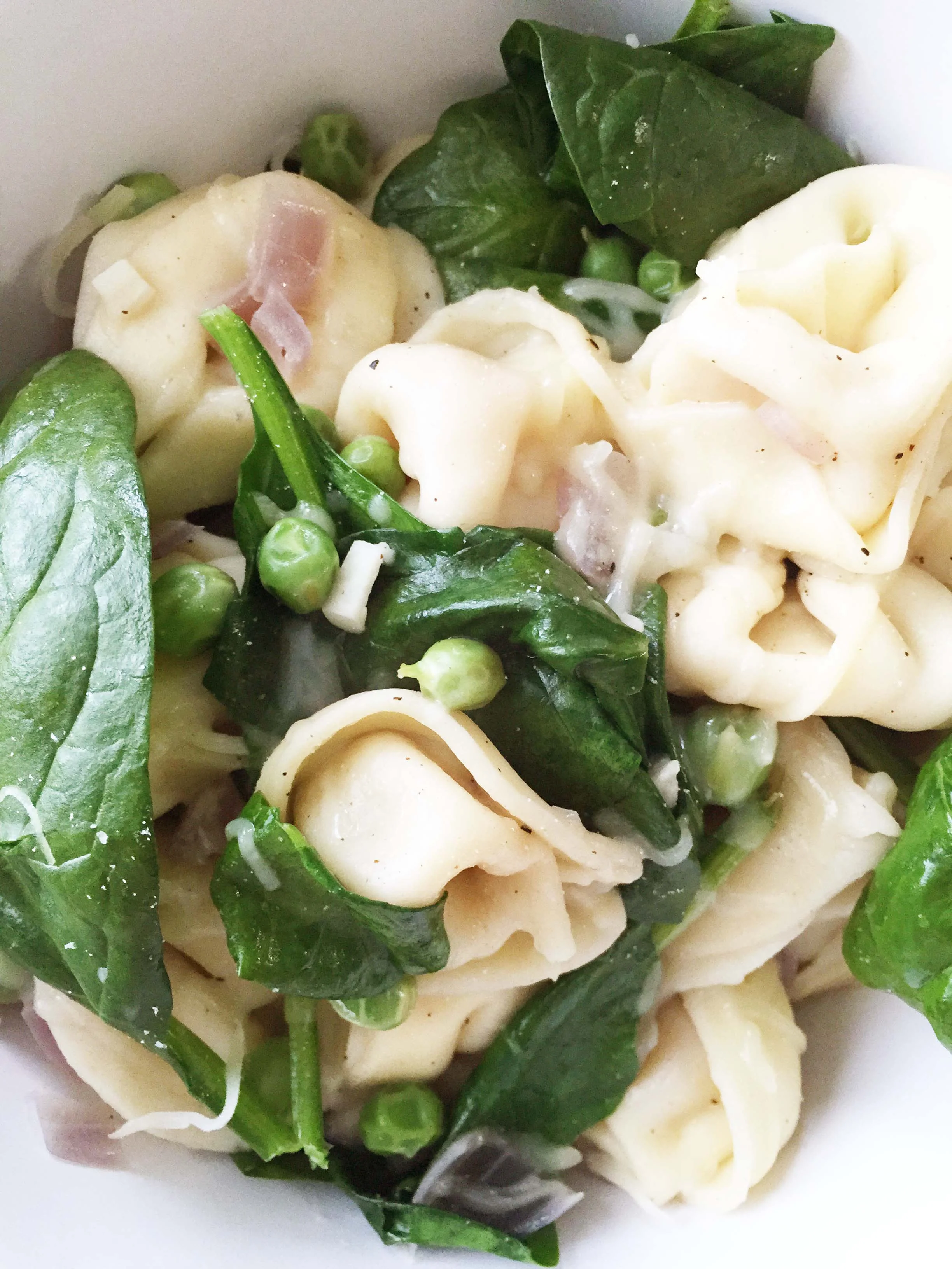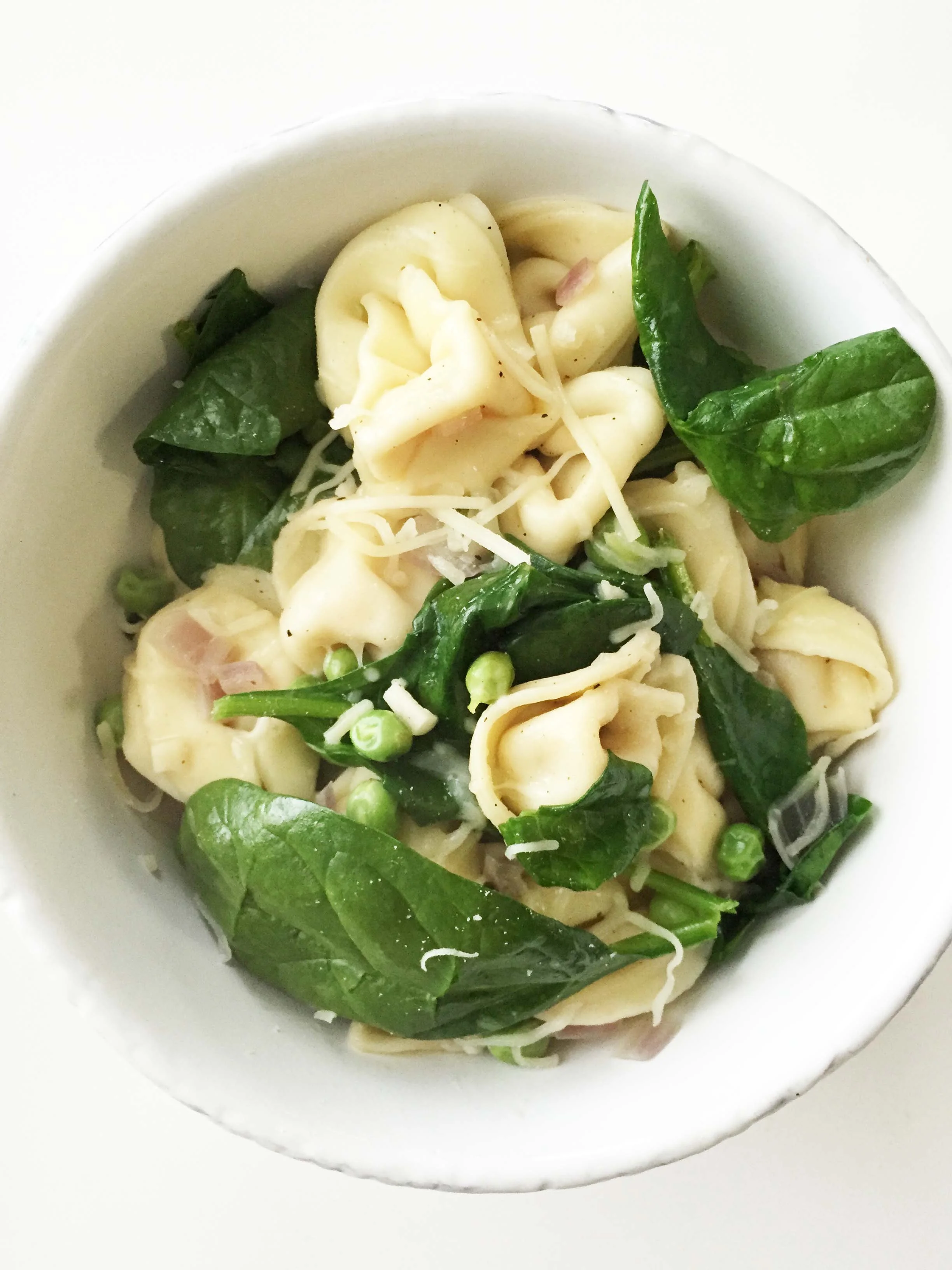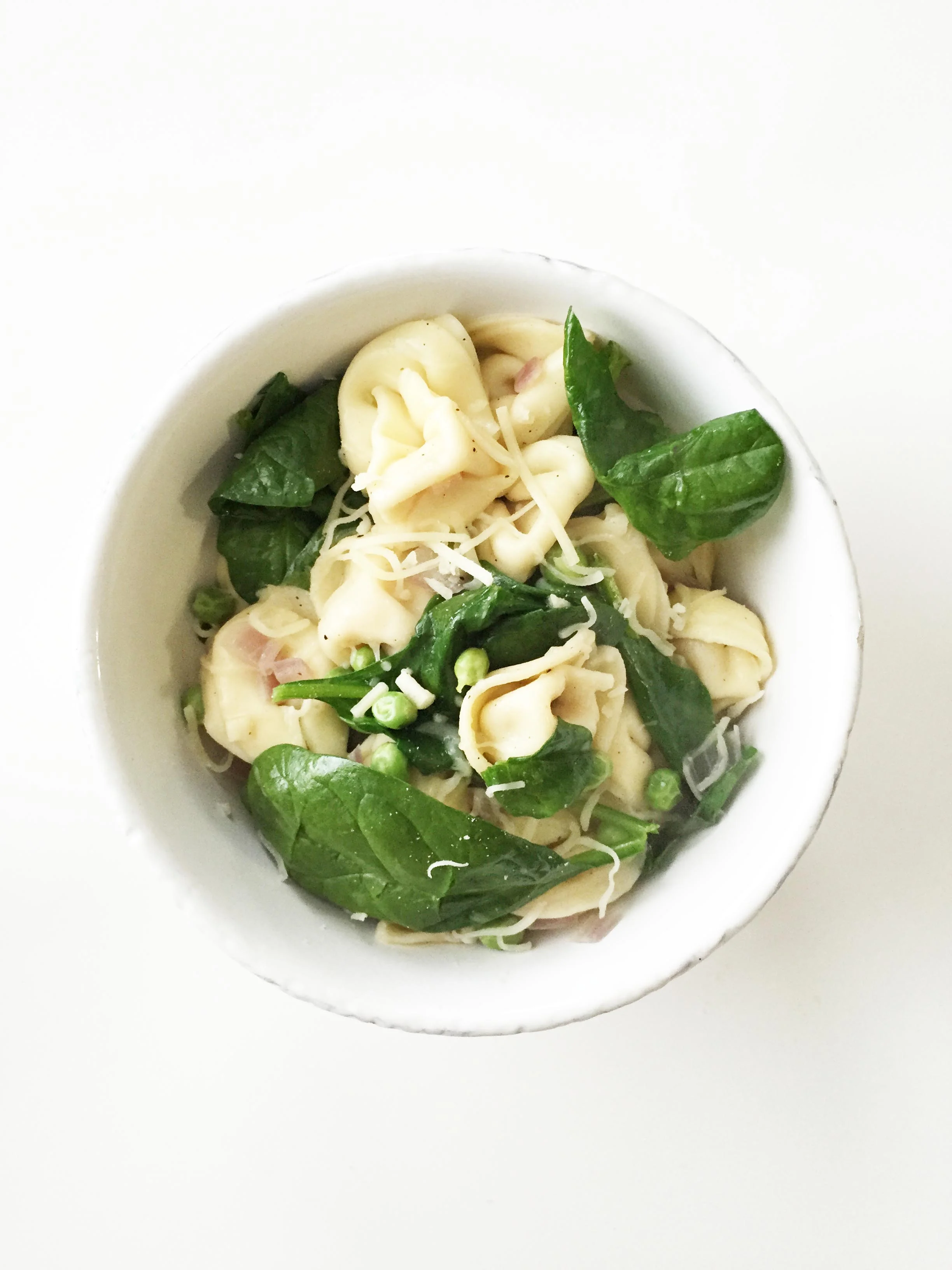 I ended up drawing some inspiration for this recipe from that very first memory I have of eating tortellini by using fresh green peas and a simple and fresh three cheese tortellini. But, being as I wanted to do a lighter take on the meal, I added in some baby spinach and swapped out the heavier Alfredo for a simple broth 'sauce'.
