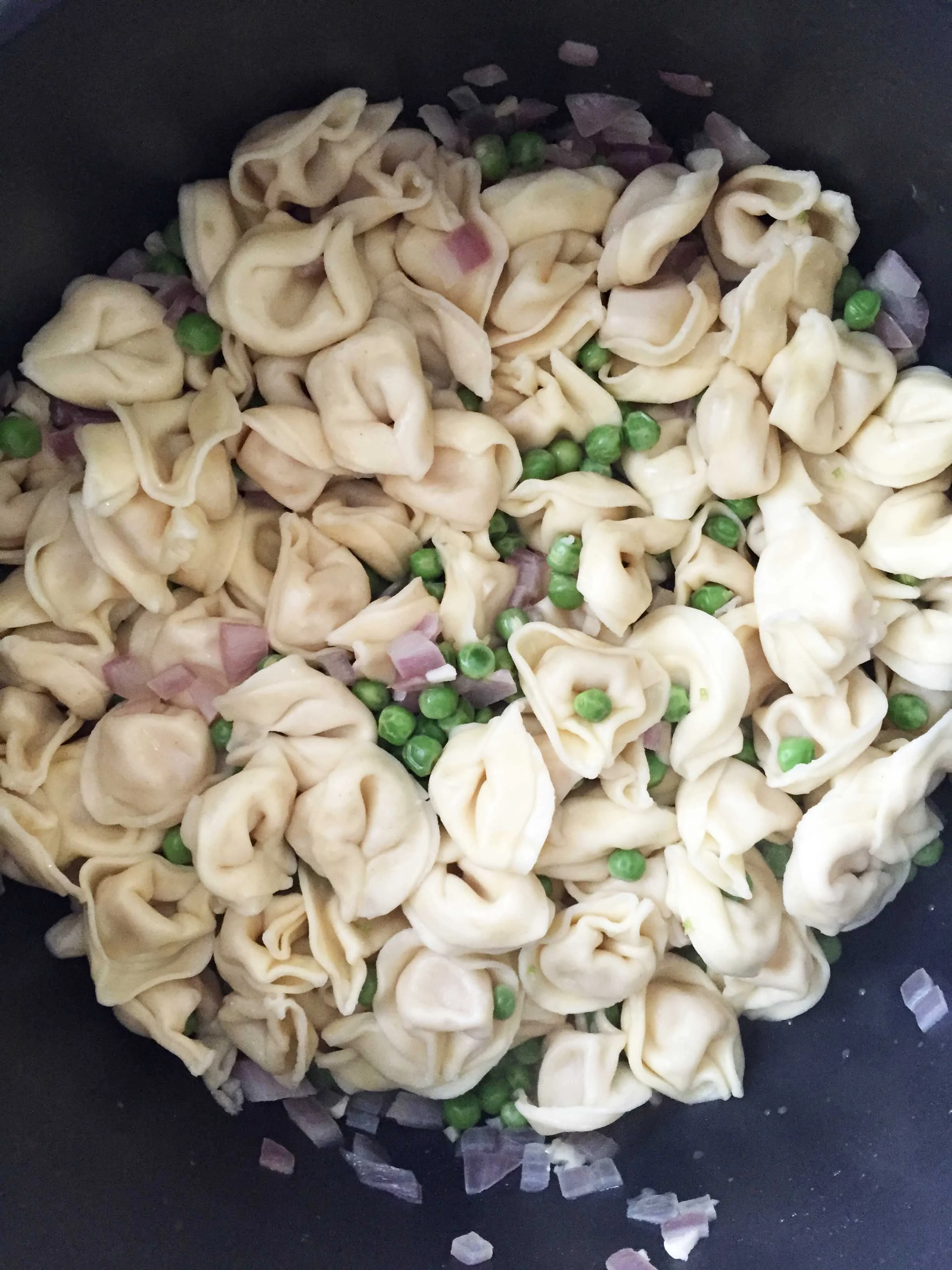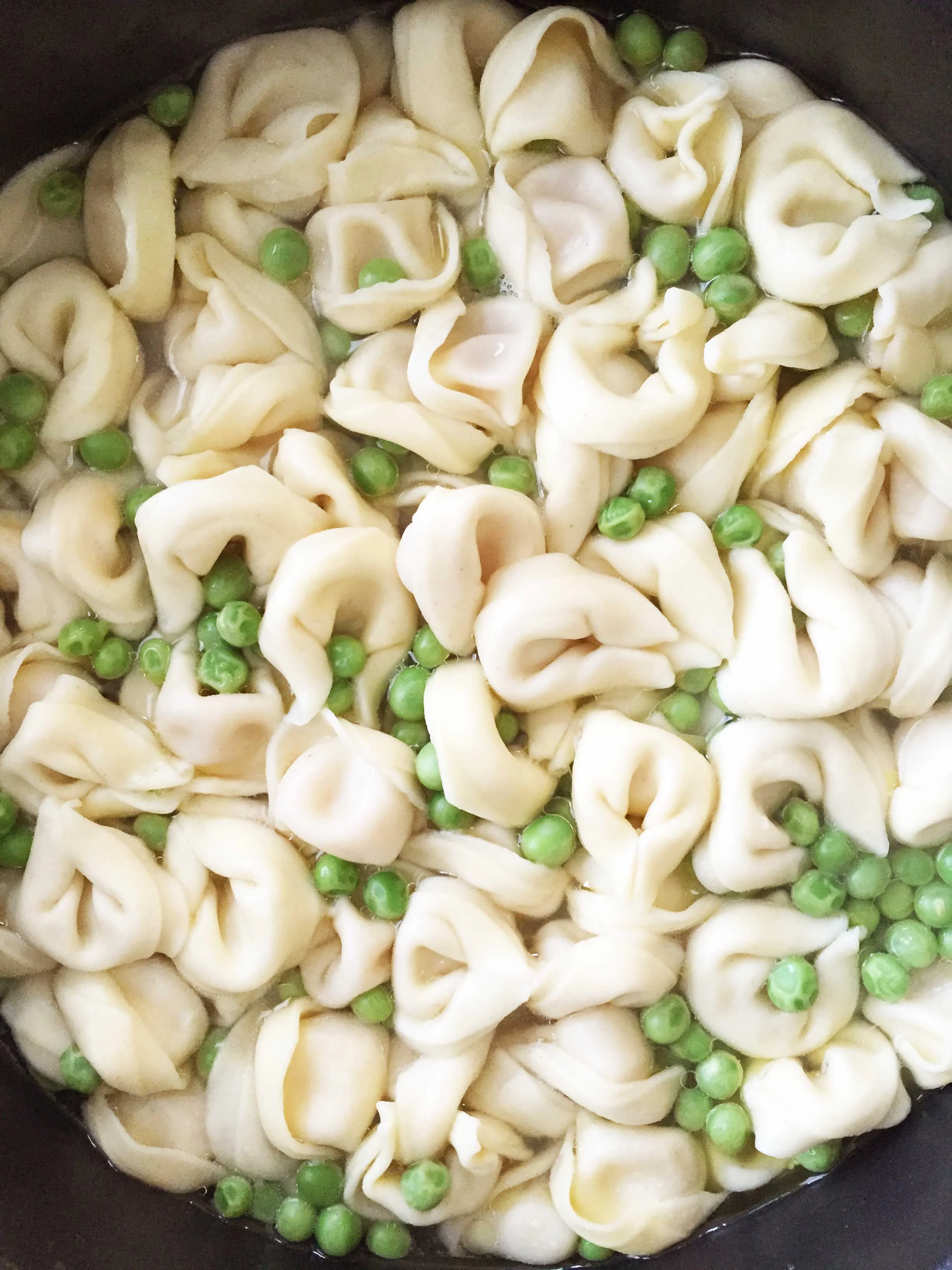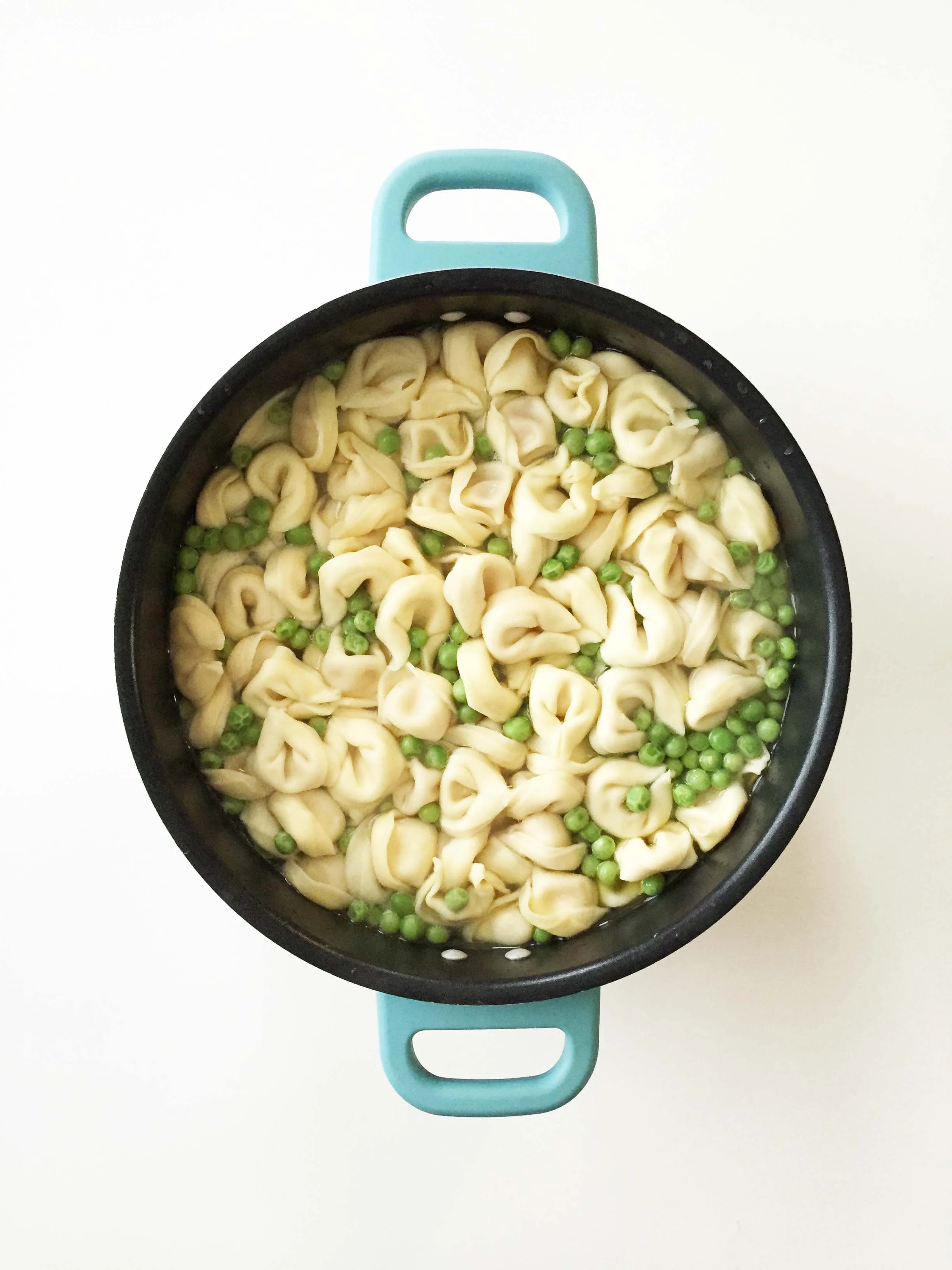 Add the peas into the tortellini in the last 2-3 minutes of cooking.