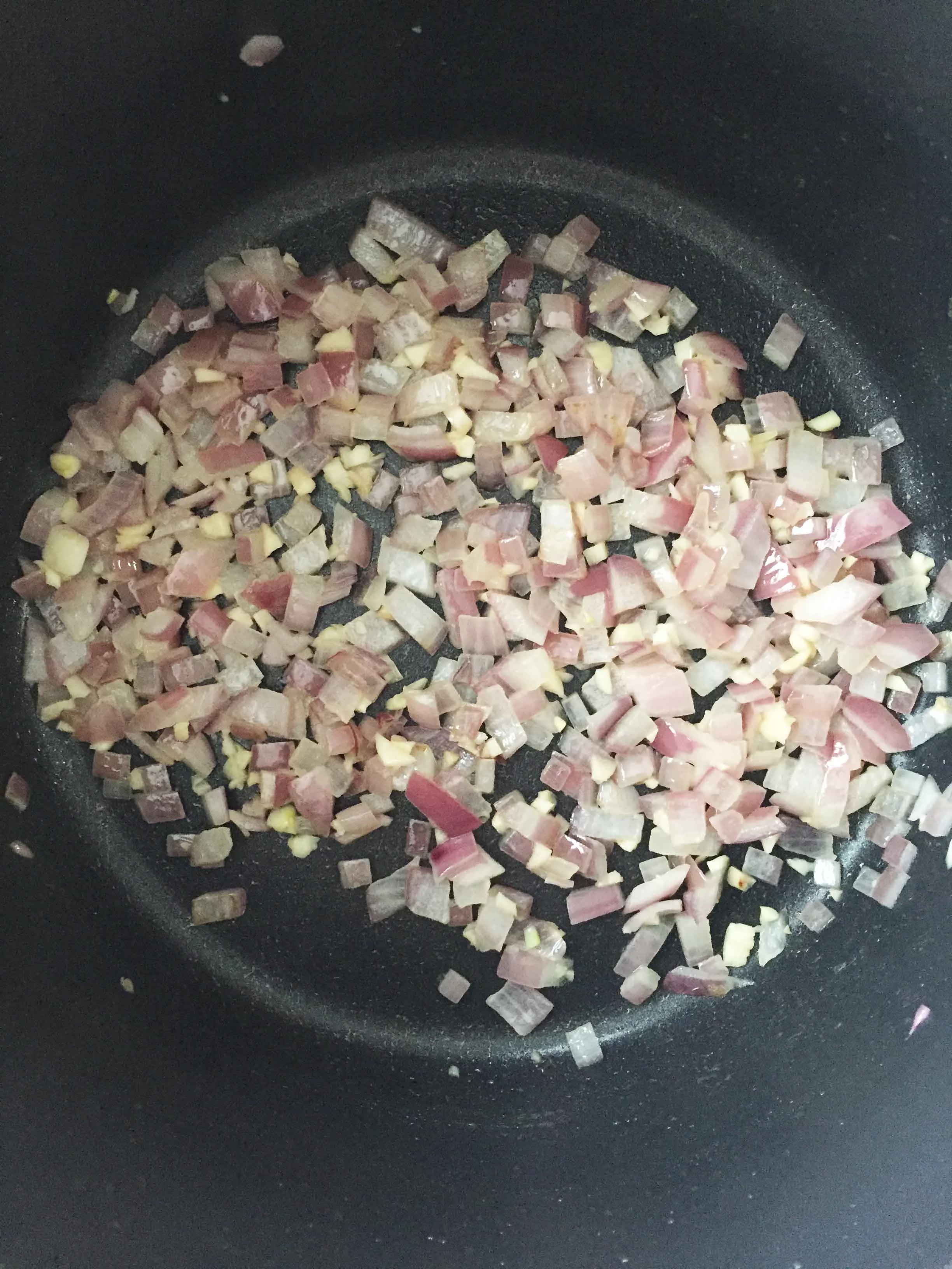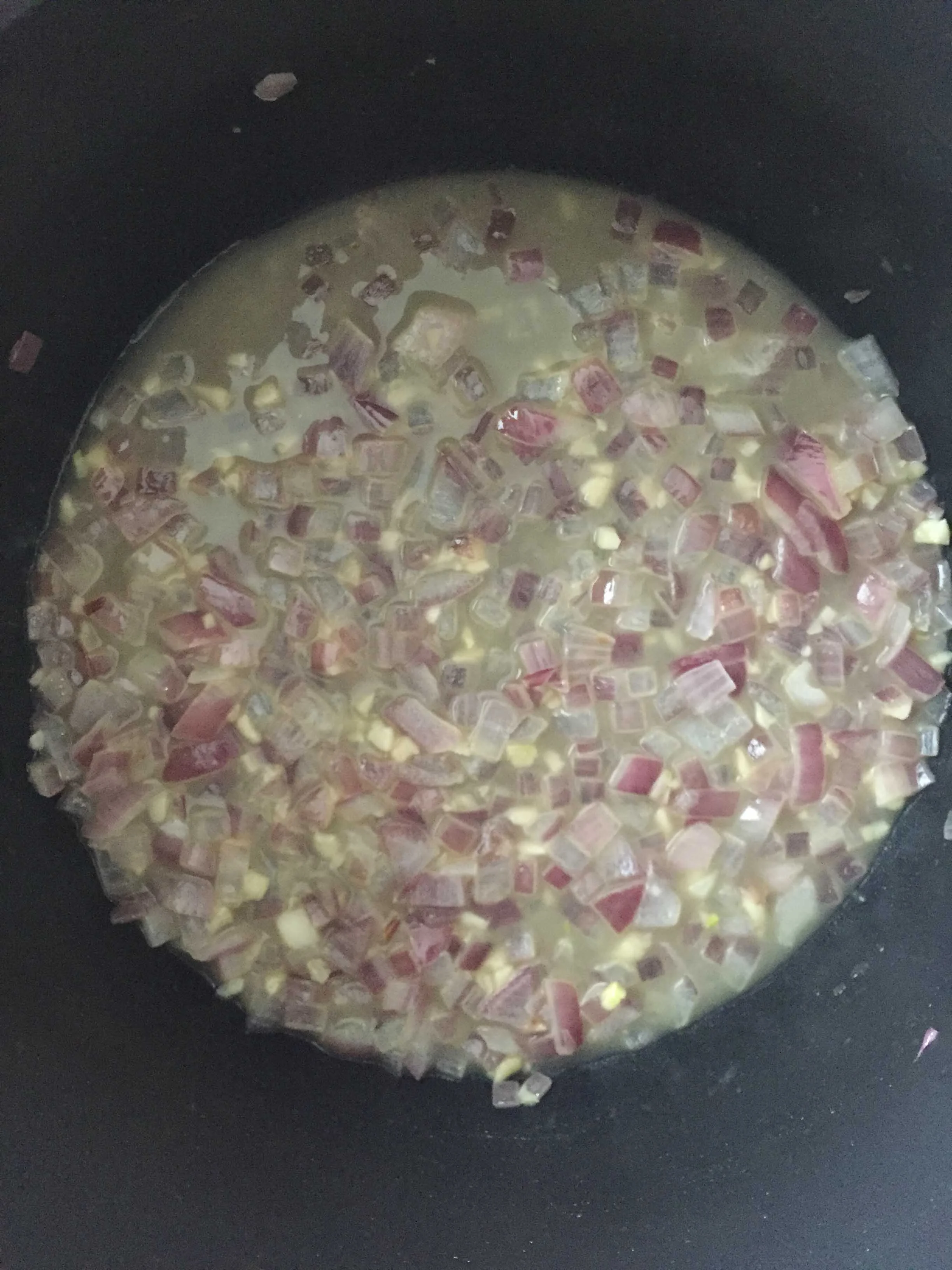 While the pasta is draining, place the red onion and butter into a large stock pot. Sauté over medium-high heat for a minute or two before adding in the garlic; reduce heat to medium and continue to cook for another minute or so.