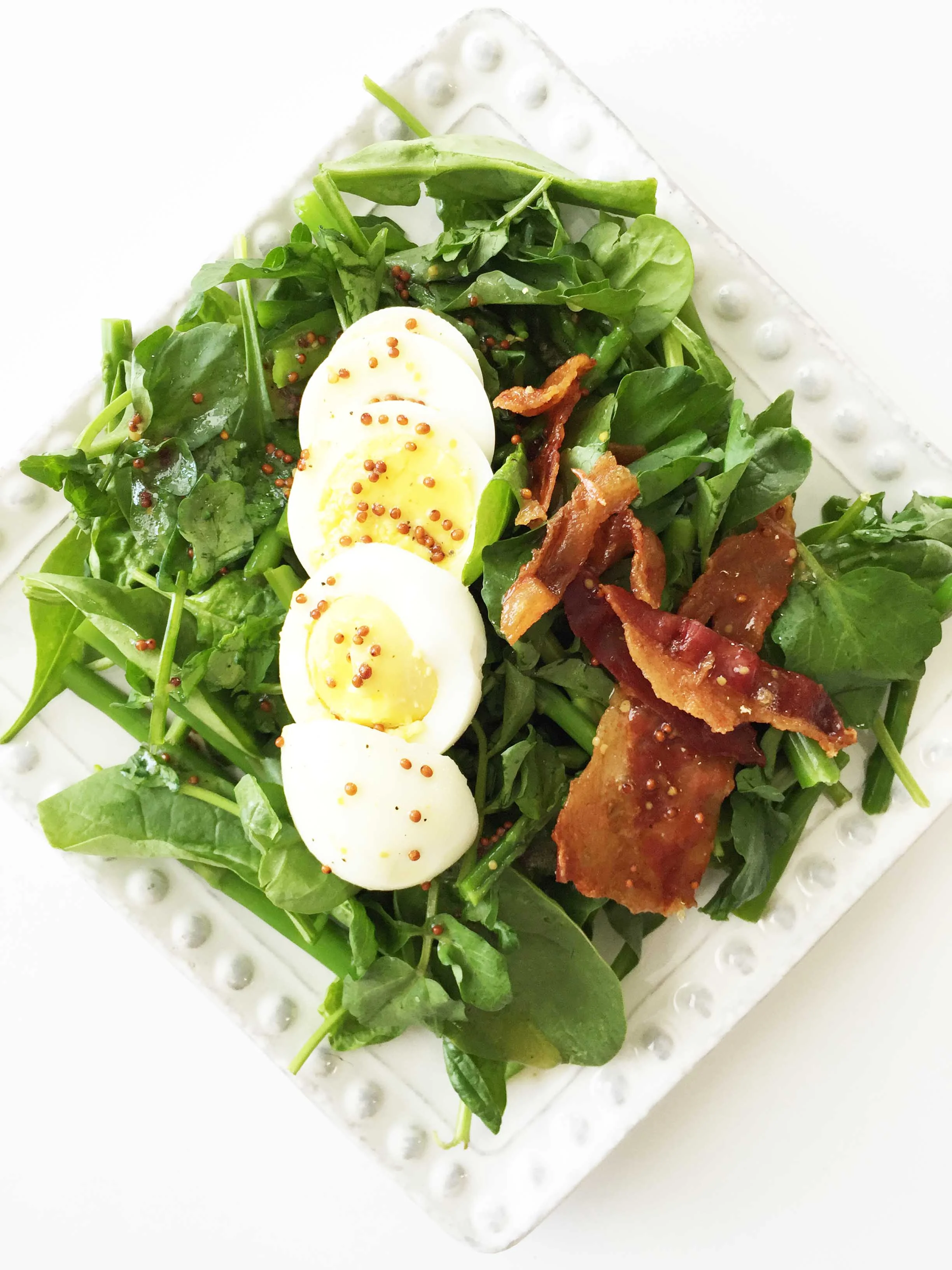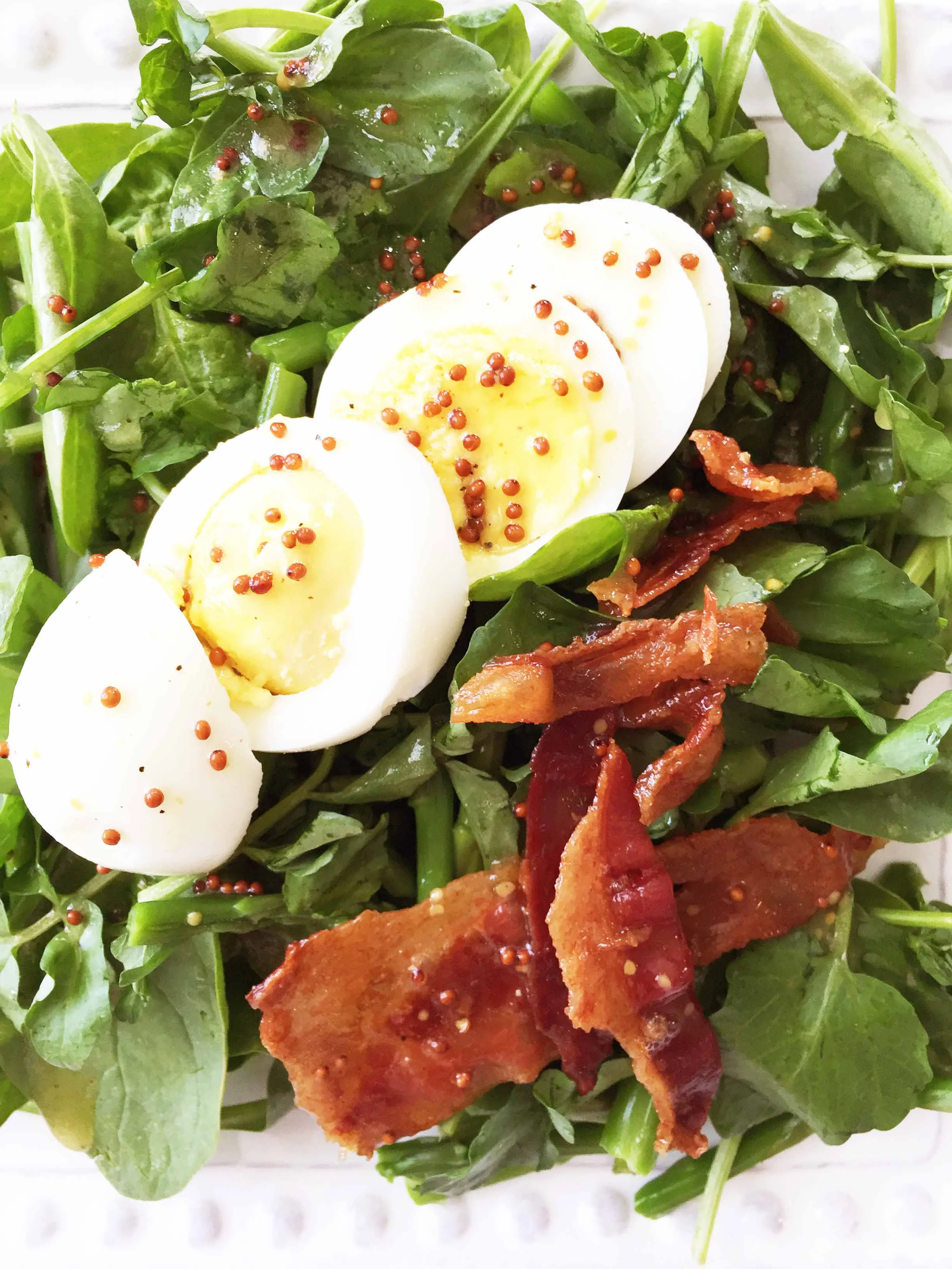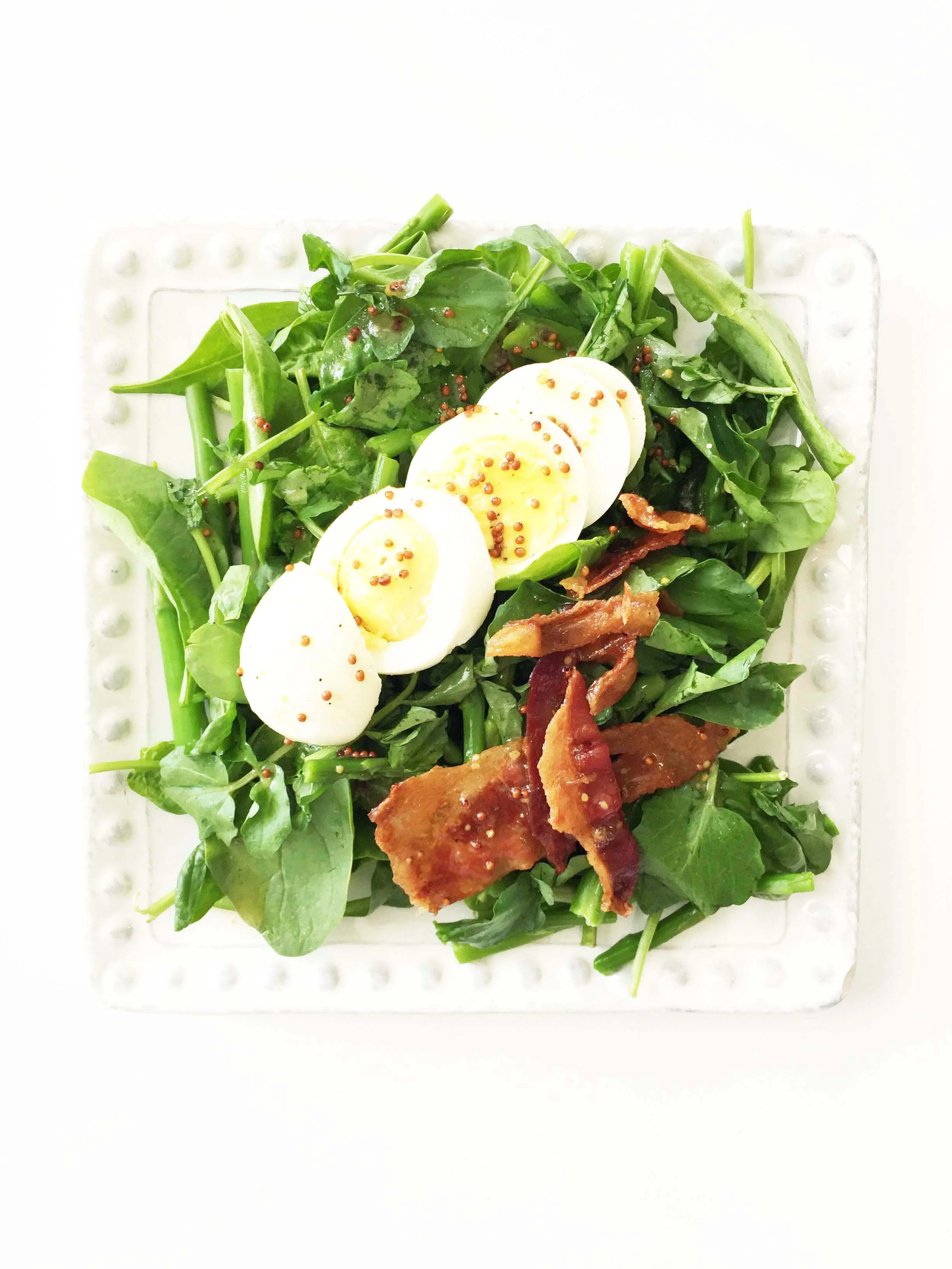 Top each salad with one sliced egg and one piece of roughly chopped bacon.