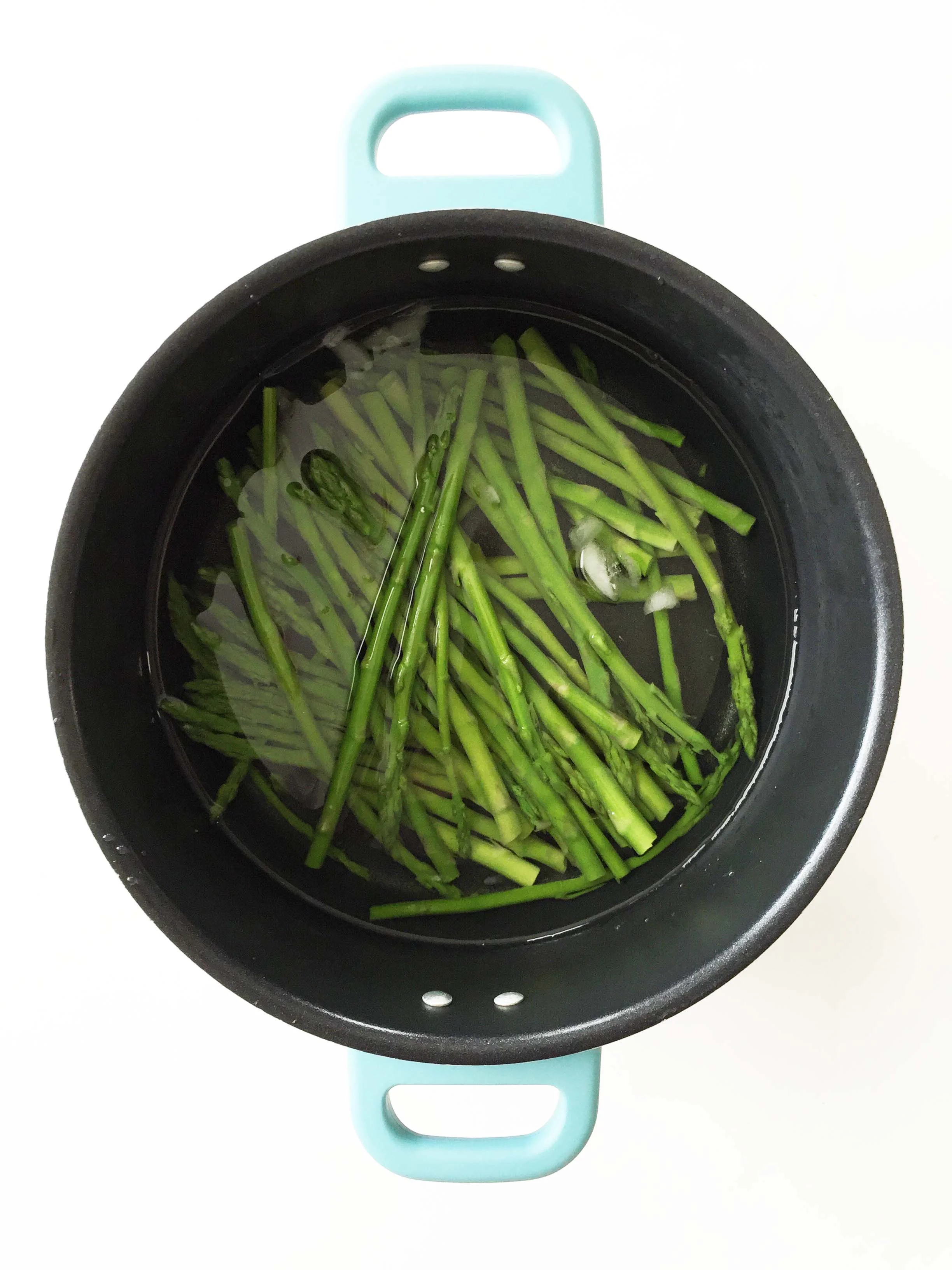 Heat a pot of water to boil and add in the asparagus; cook for 2 minutes and then remove to transfer to an ice bath.