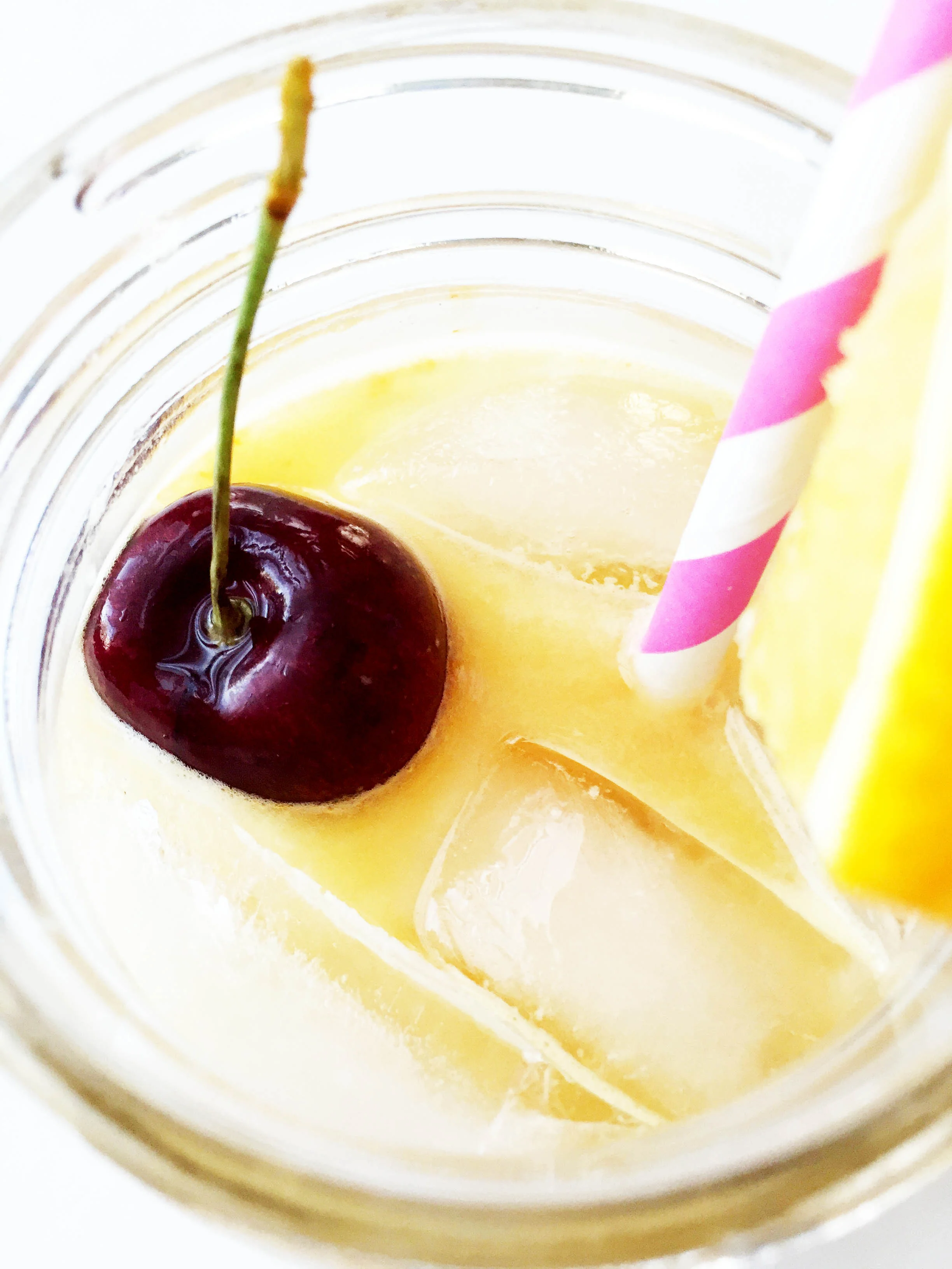 Garnish with 2 pitted cherries and an orange wedge. Enjoy right away!