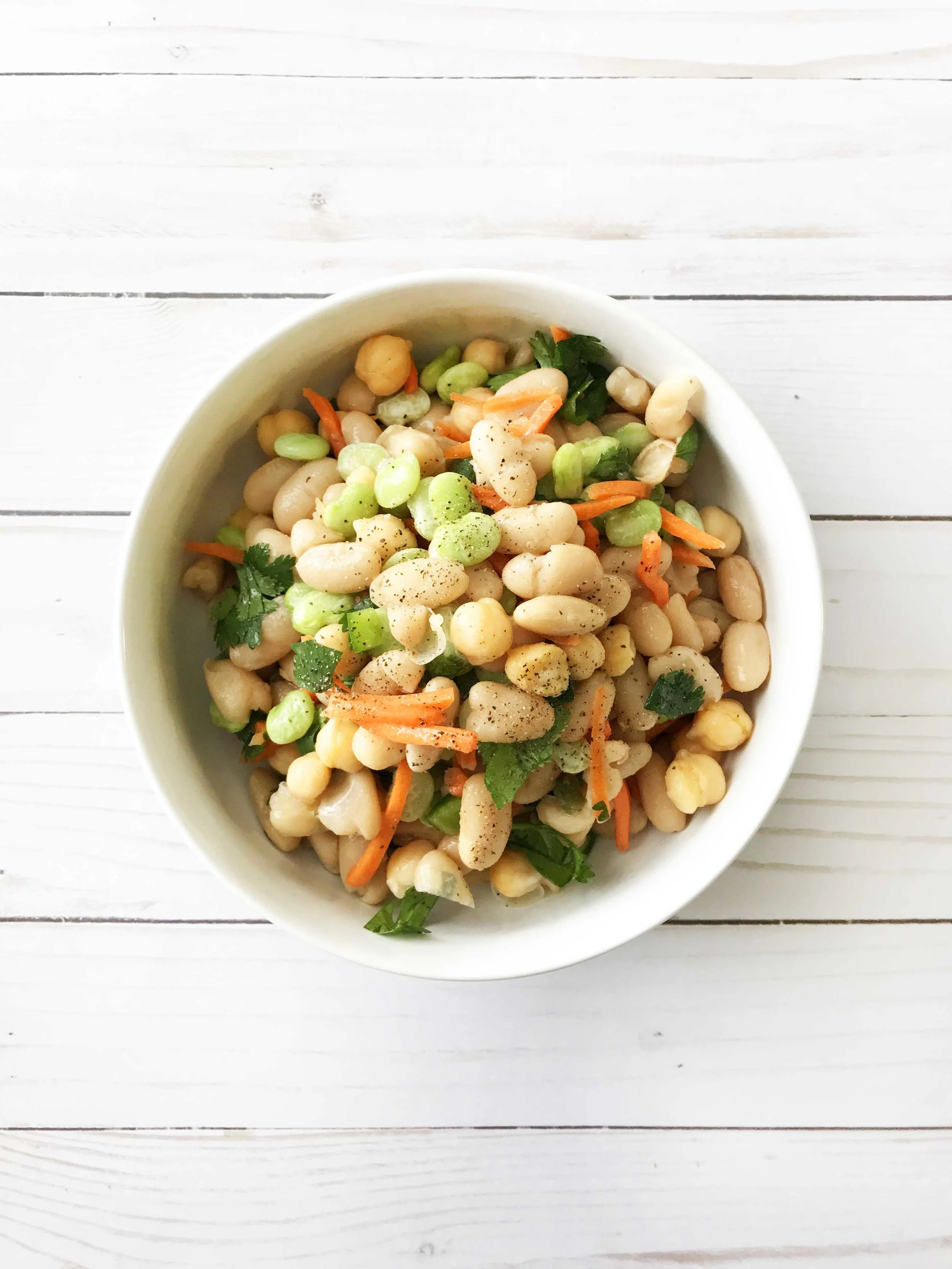 Why not impress your tastebuds and save the calories for a beer or glass of wine at your next cookout instead? Now that's what I call BBQ friendly! This salad here is served COLD and loaded up with cannelloni beans, garbanzo beans, and baby lima beans. Tossed with a simple dressing and a few other veggies for added crunch!