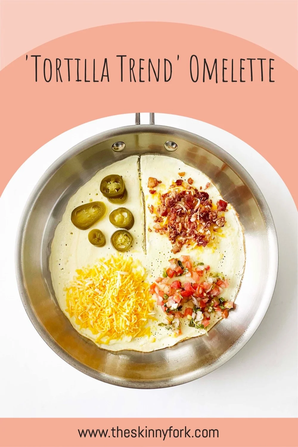 To make this 'Tortilla Trend' Omelette just little more health conscious, I used one whole egg and then a white plus some low fat cottage cheese to give a boost of protein and stretch out the egg usage a bit more. I also used a reduced fat shredded cheese and loaded in the fresh pico to get all the veggies in there that I could.