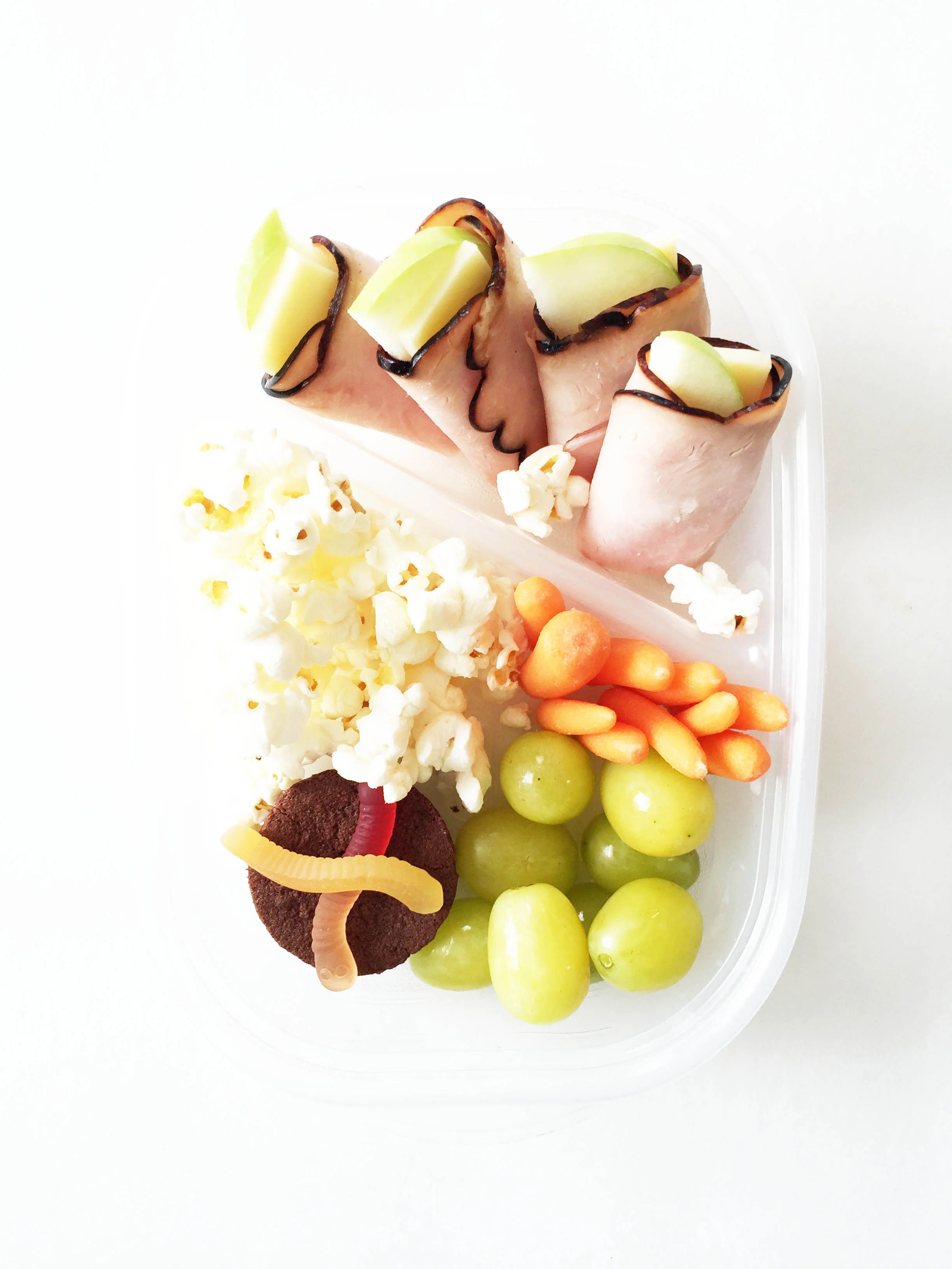 Along with the SkinnyPop® Popcorn I make these wonderful Turkey, Apple & Cheese Wraps which are a fun twist on one of my favorite sandwiches. On the side I gave her a nice serving of green grapes and some baby carrots. And of course, I can't forget her treat; a gluten-free brownie and some organic gluten-free gummy worms! You know, because she's a book worm.