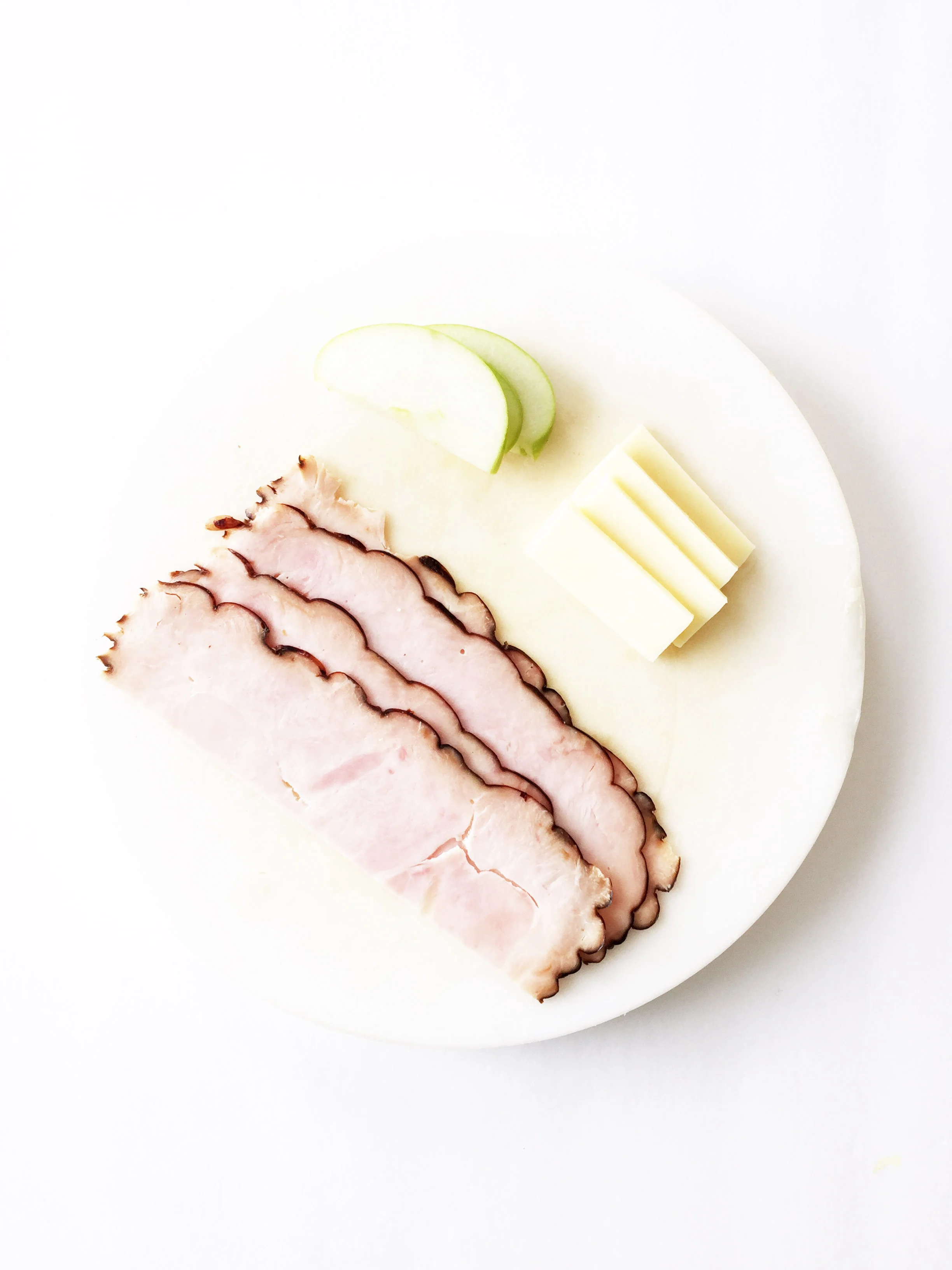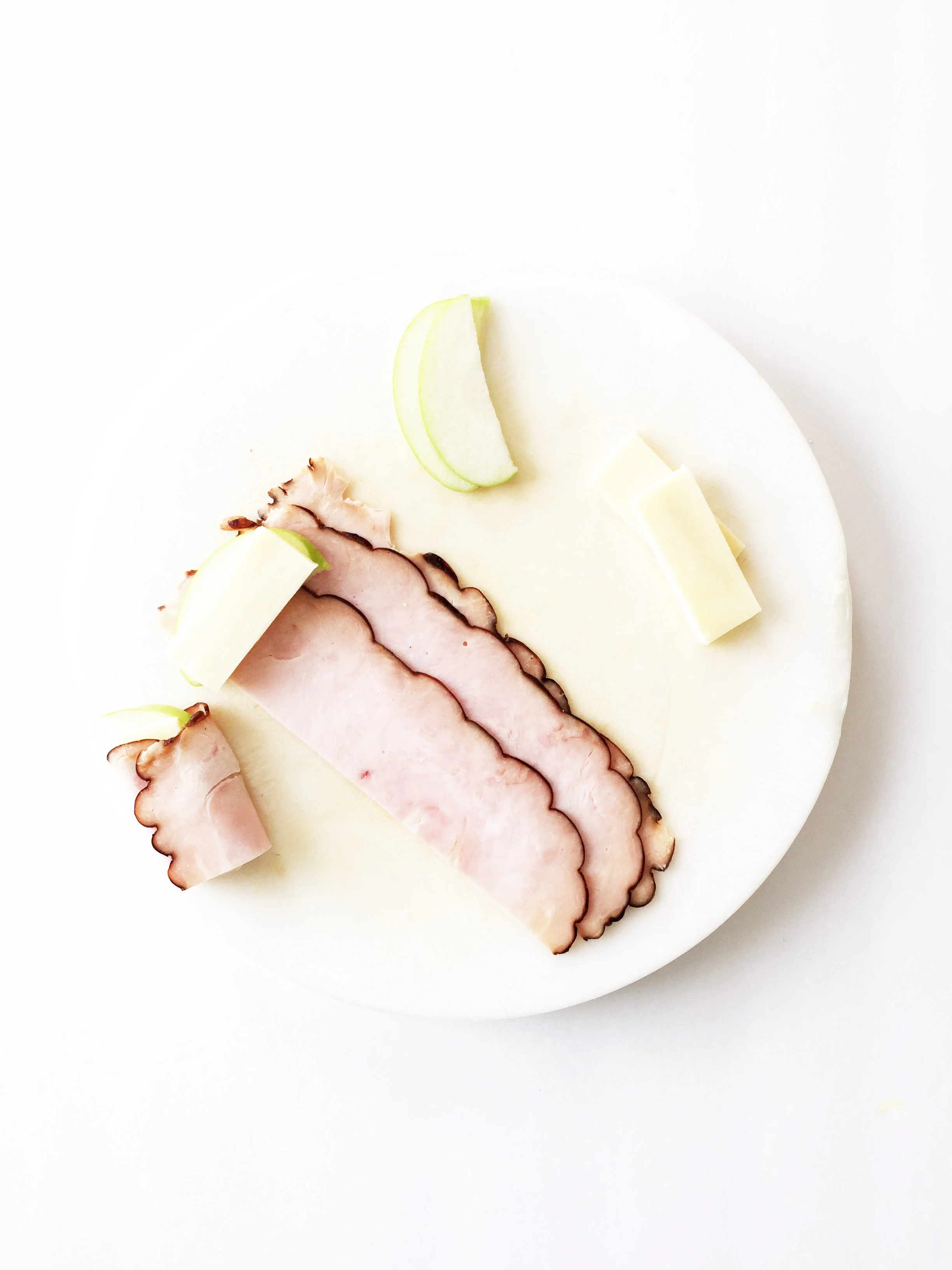 Slice the turkey length wise and wrap one slice of apple and a piece of cheese up in the turkey.
