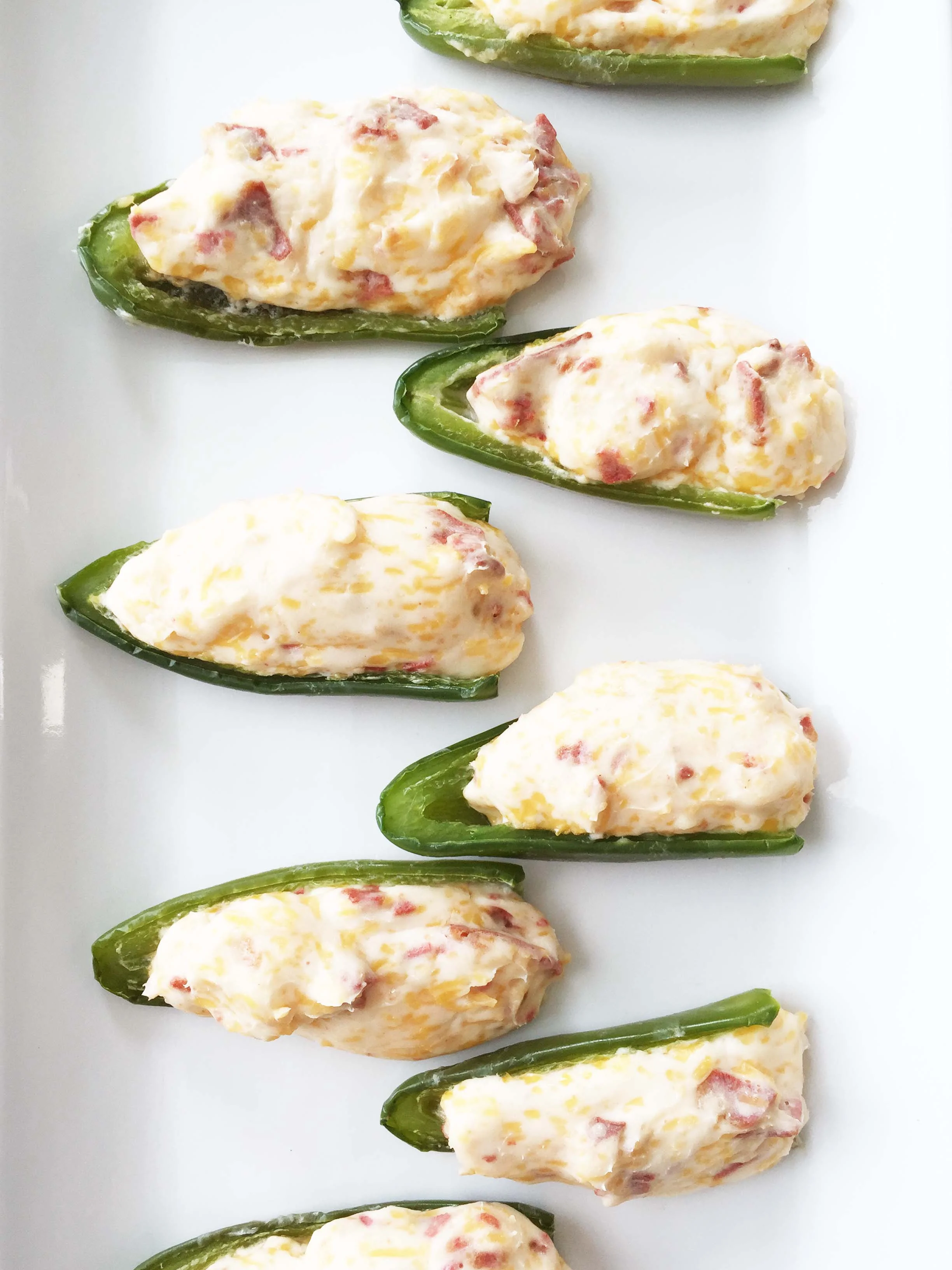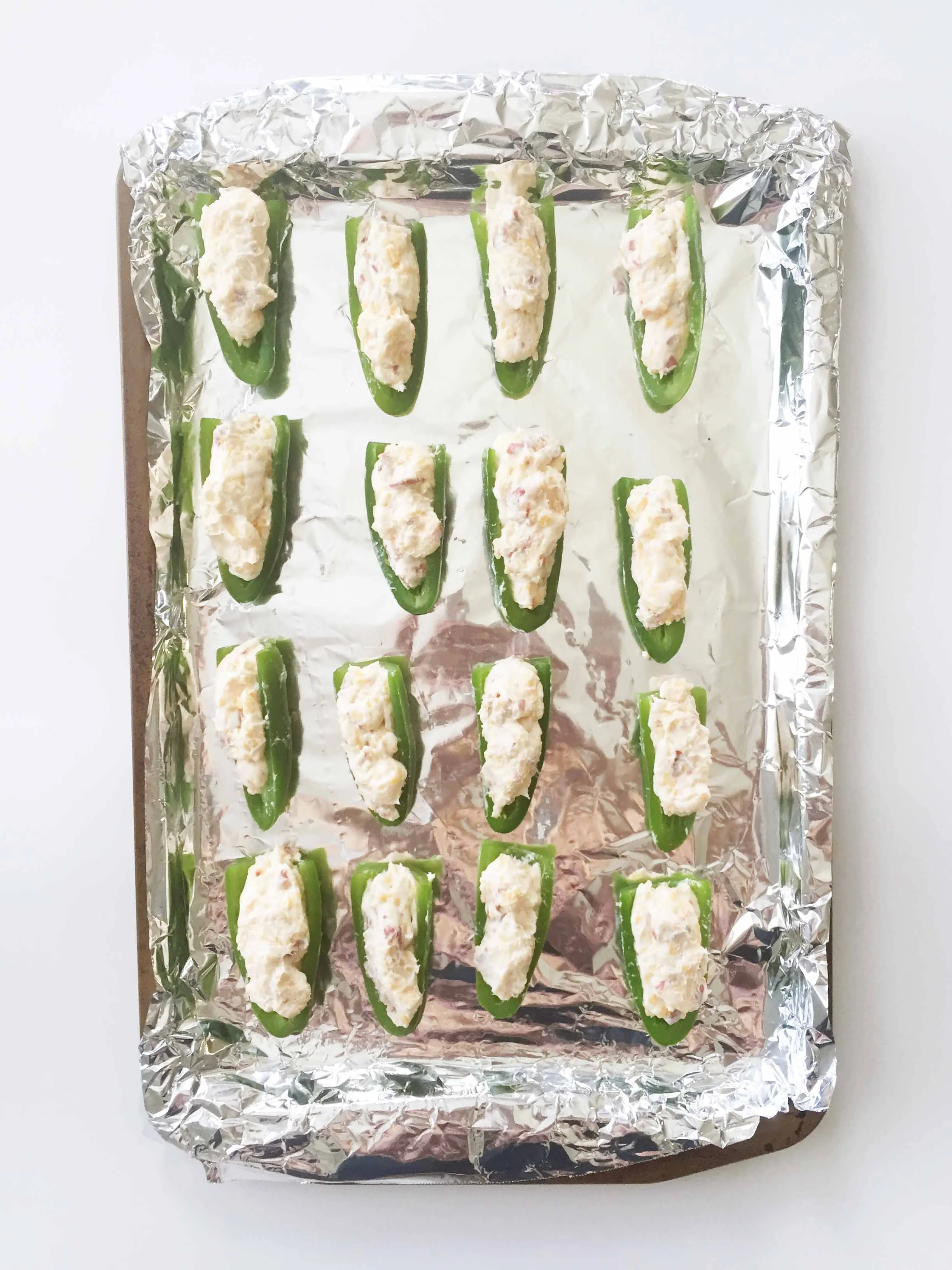 Spoon or pipe the cream cheese mixture evenly into the par-boiled jalapeños.