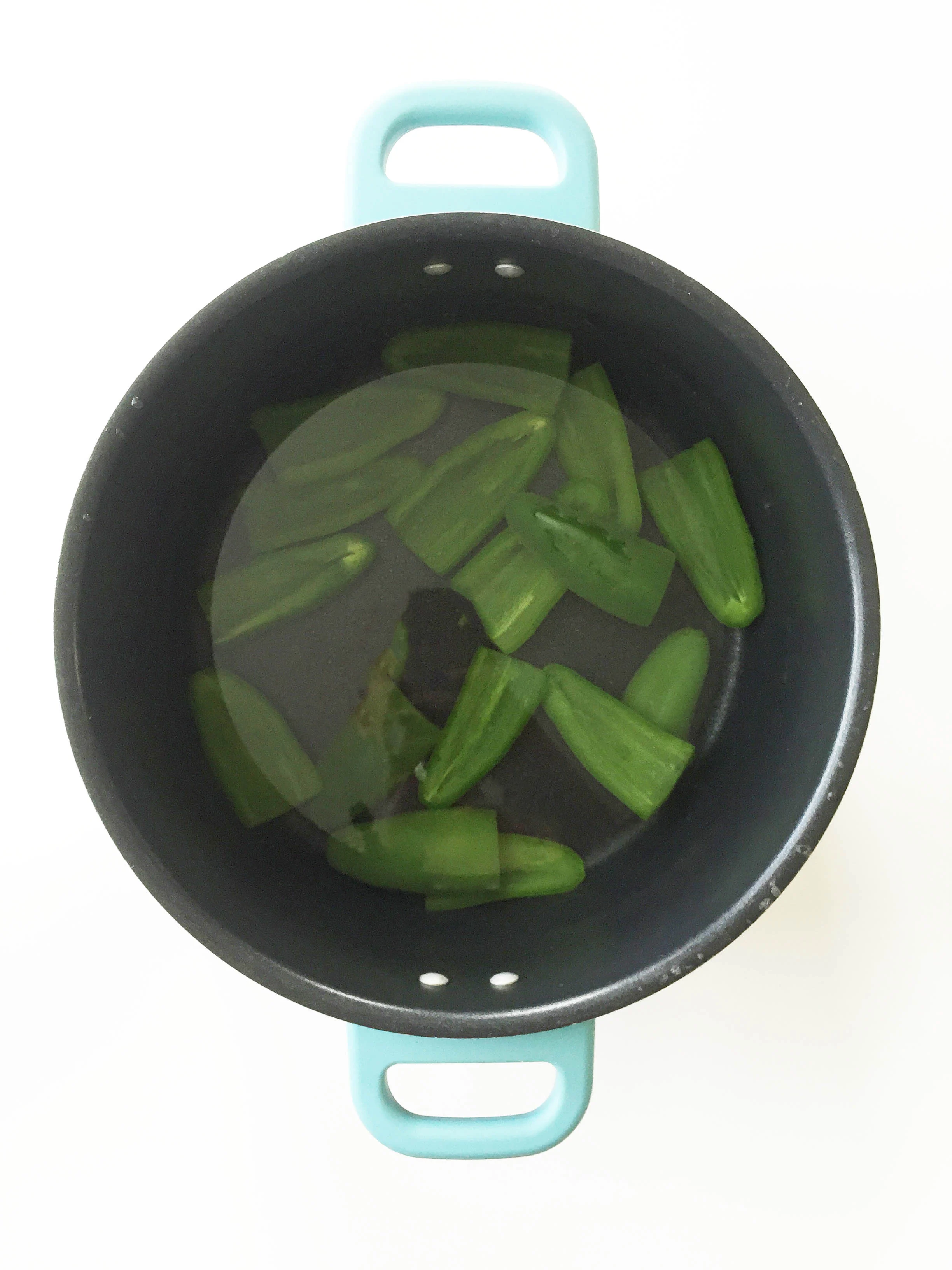 Bring a large pot of water to a point and toss the seeded jalapeño halves in carefully.