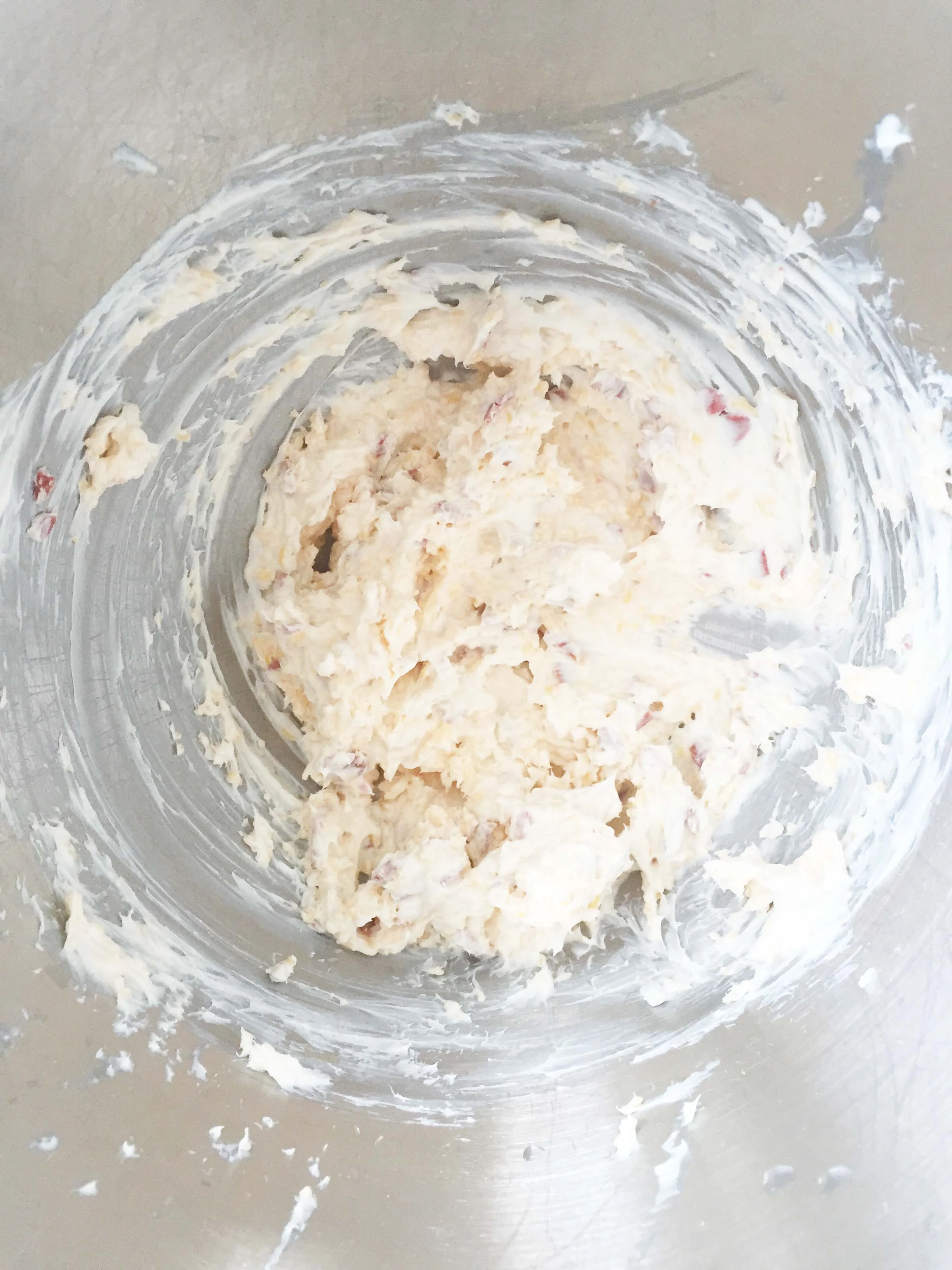 Beat together the cream cheese, cheddar, and bacon crumbles until well combined.