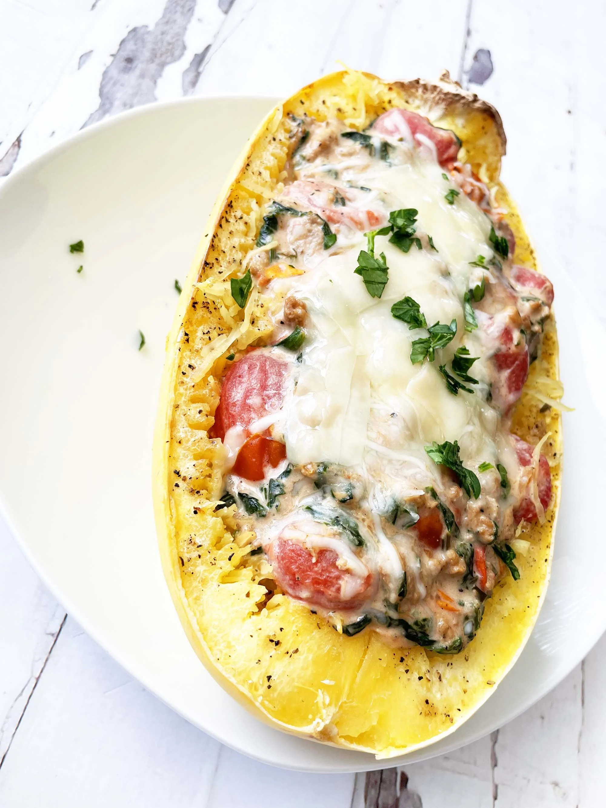 I lightened this 'Viral' Spaghetti Squash Bowl up by using a lean ground turkey as the base. I also subbed in way more veggies and fat free mozzarella in place of regular. I promise though, no one will notice the small changes. This ends up being a really hearty dish, and half of one of these bowls is plenty enough filling. Especially if you’re serving with anything on the side!