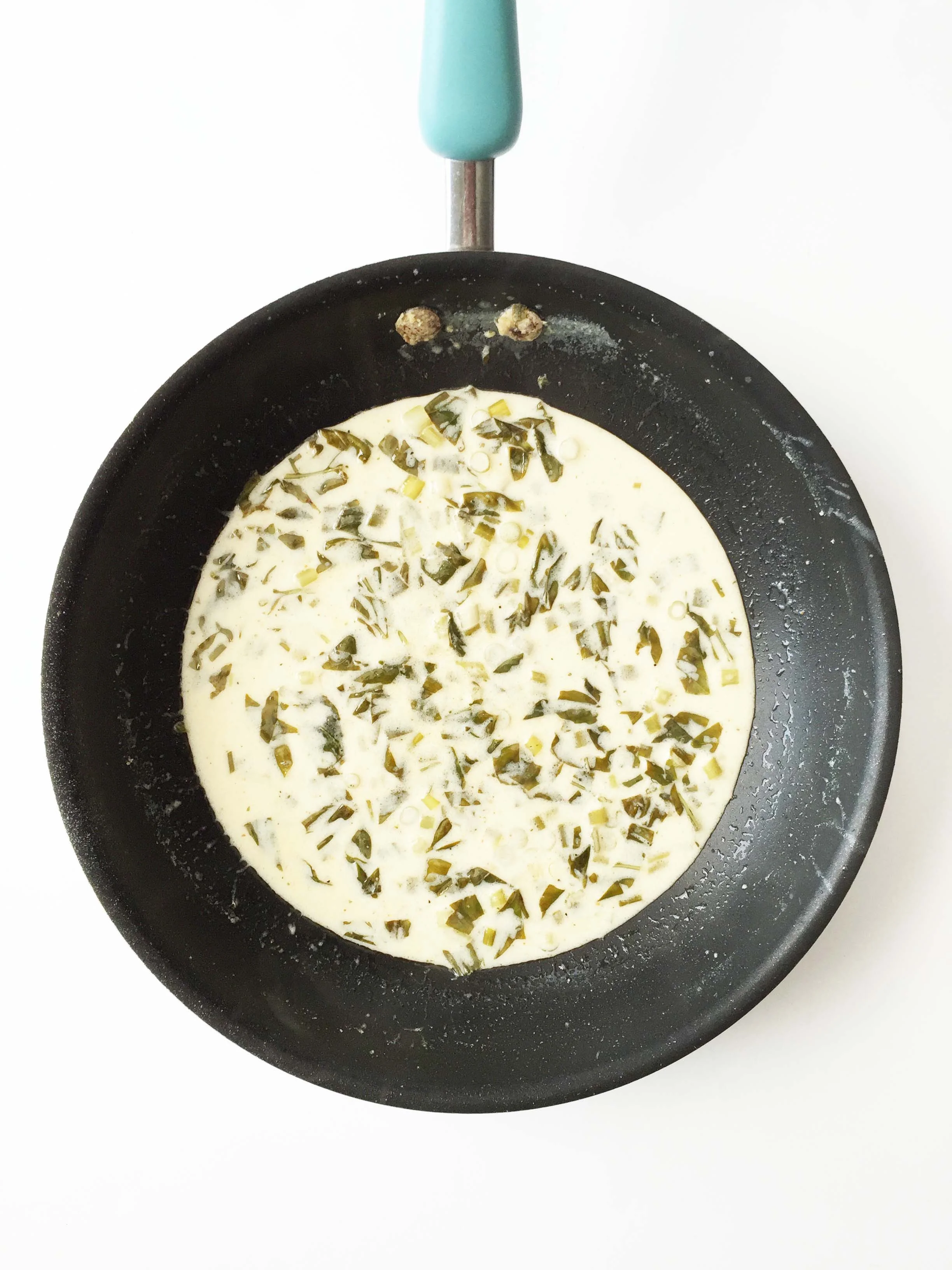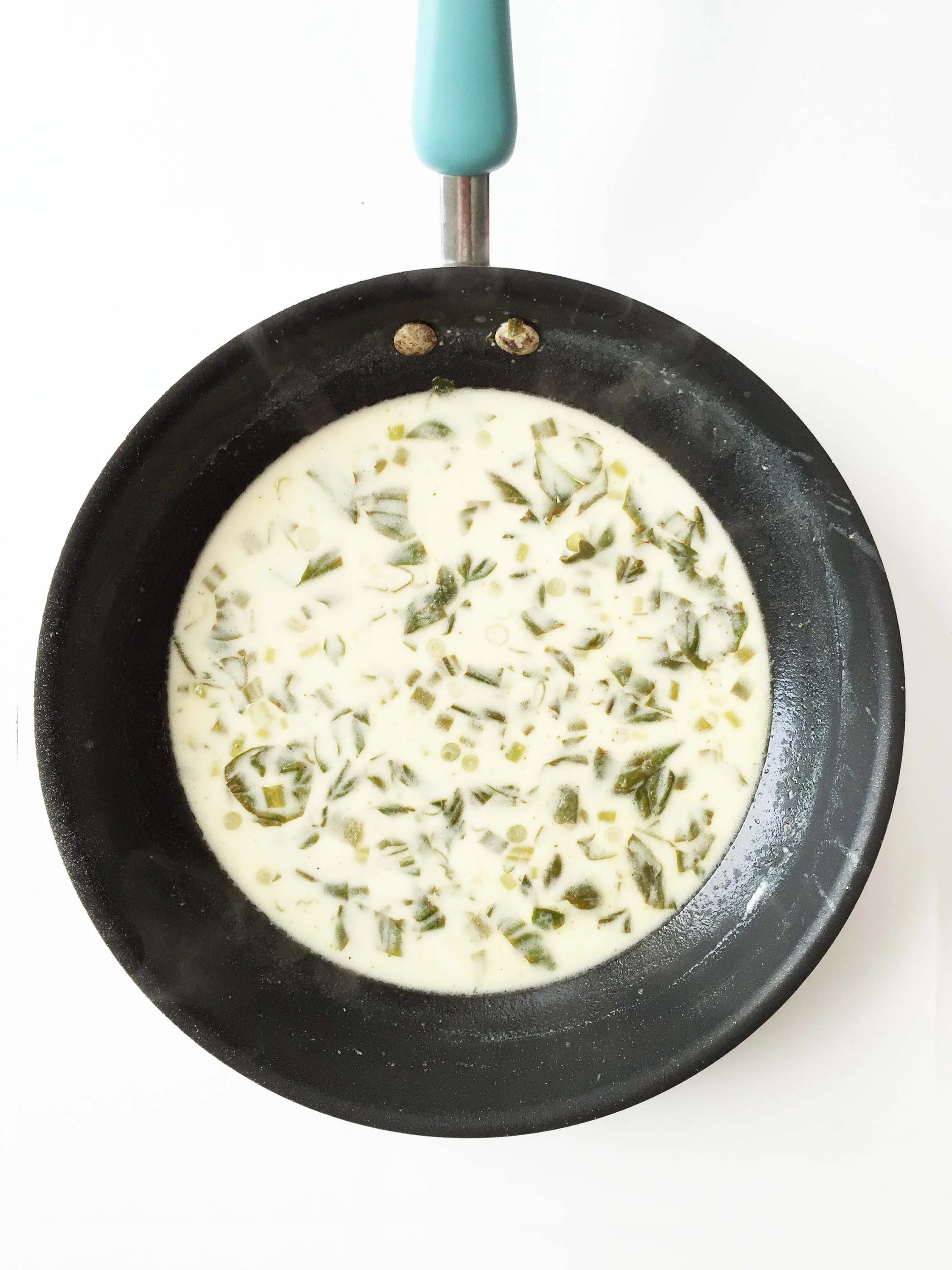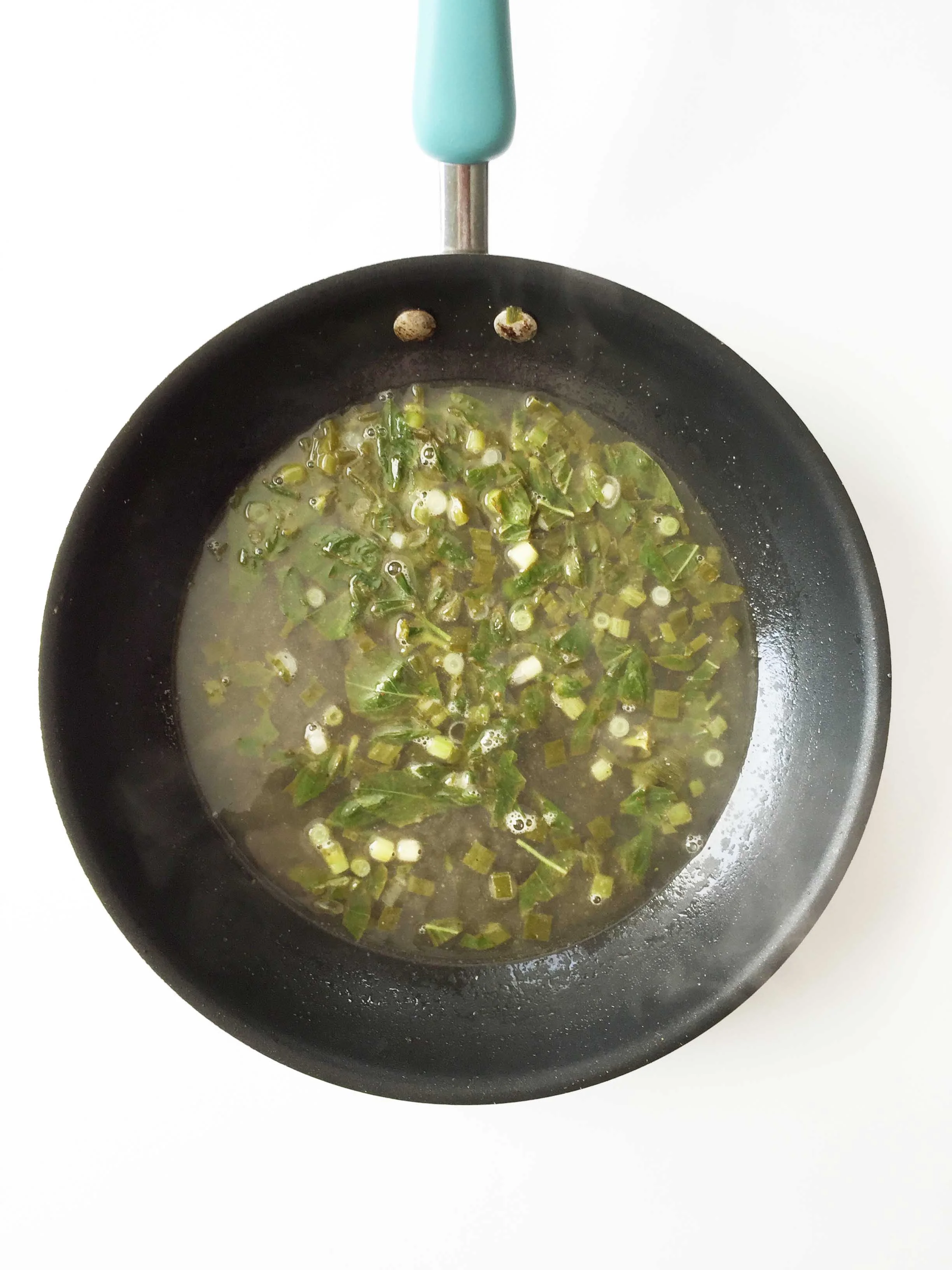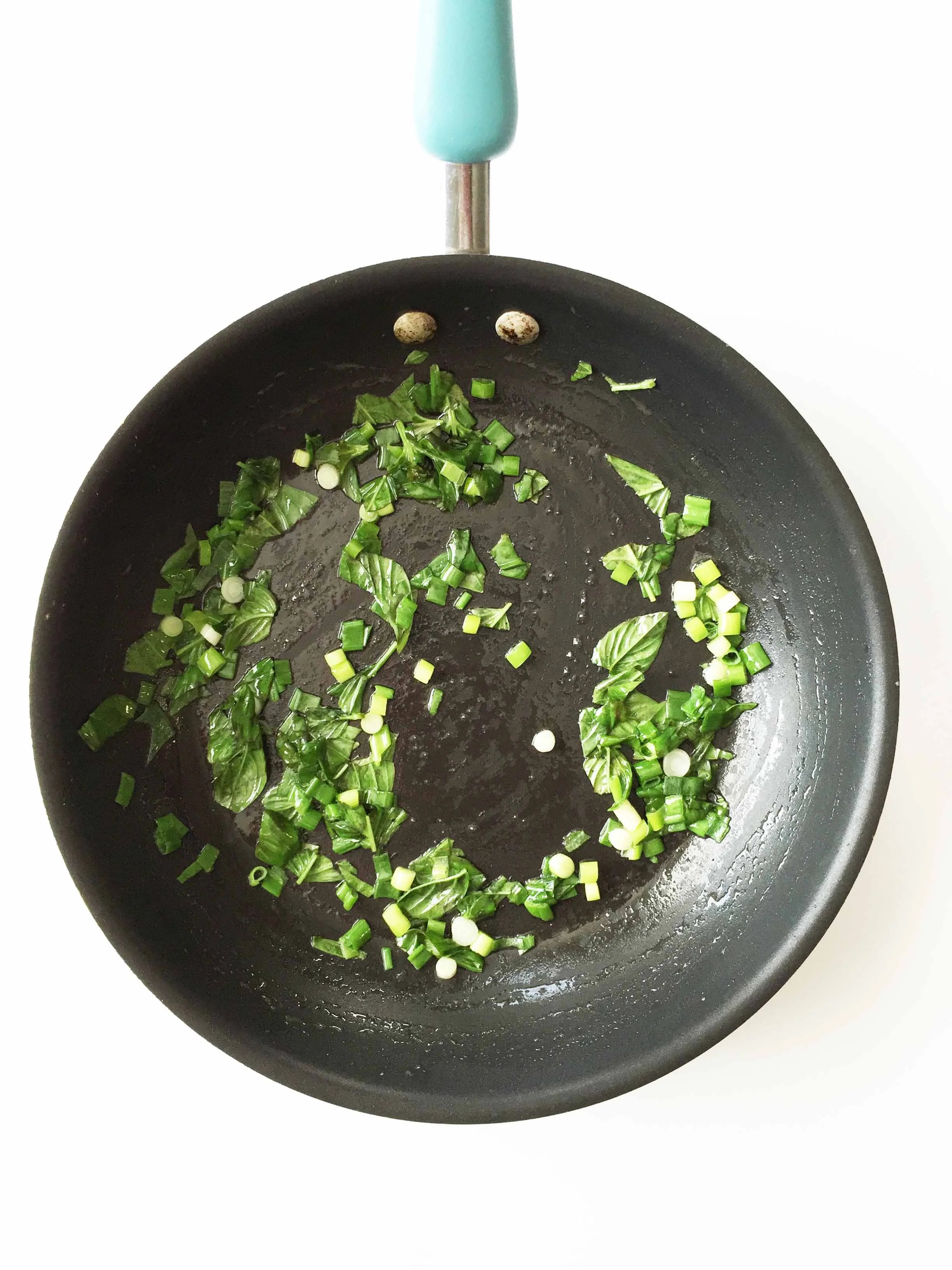 Add 1 Tbsp. butter, 2 chopped green onions, and 1/4 C. minced basil to the skillet and heat over medium-heat to sauté the herbs for a few minutes.