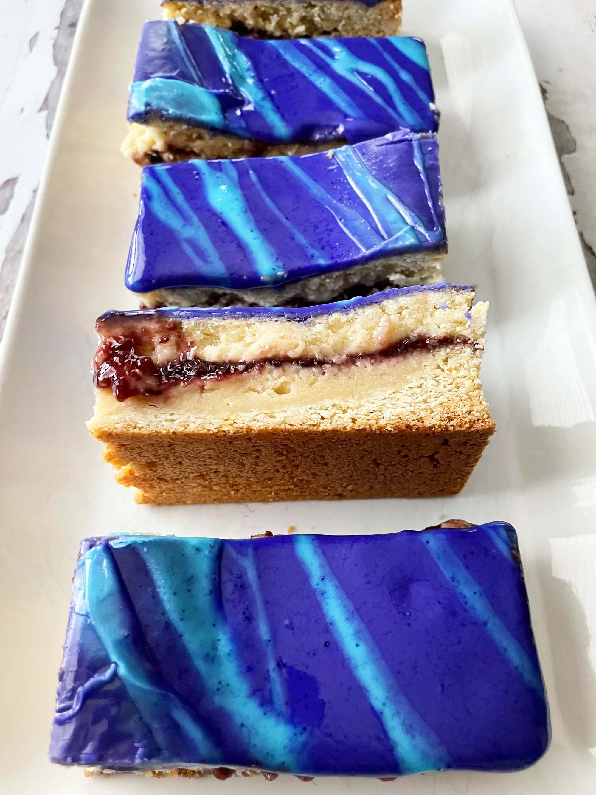 - Once cooled, top the bars with the purple food coloring and then drizzle with the blue. Set aside to allow the frosting to firm up.